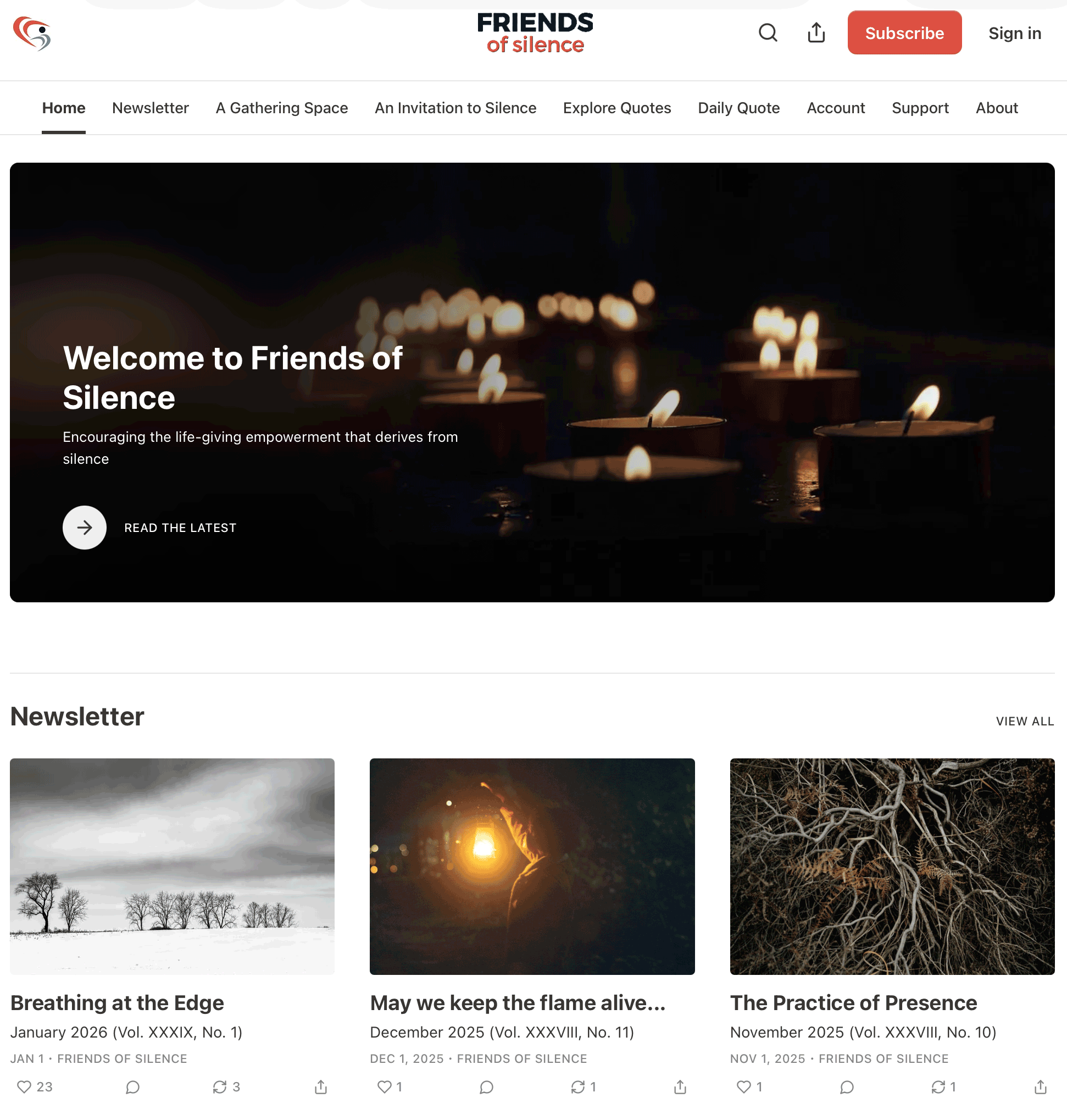 Enjoying the Friends of Silence monthly newsletter? Now you can sign up to receive a free daily quote in your inbox each morning taken from more than 37 years of 410 newsletters and 5,450 quotes on silence and the contemplative path.